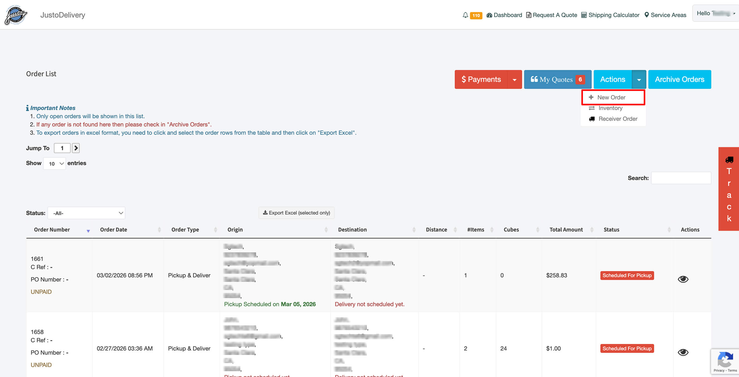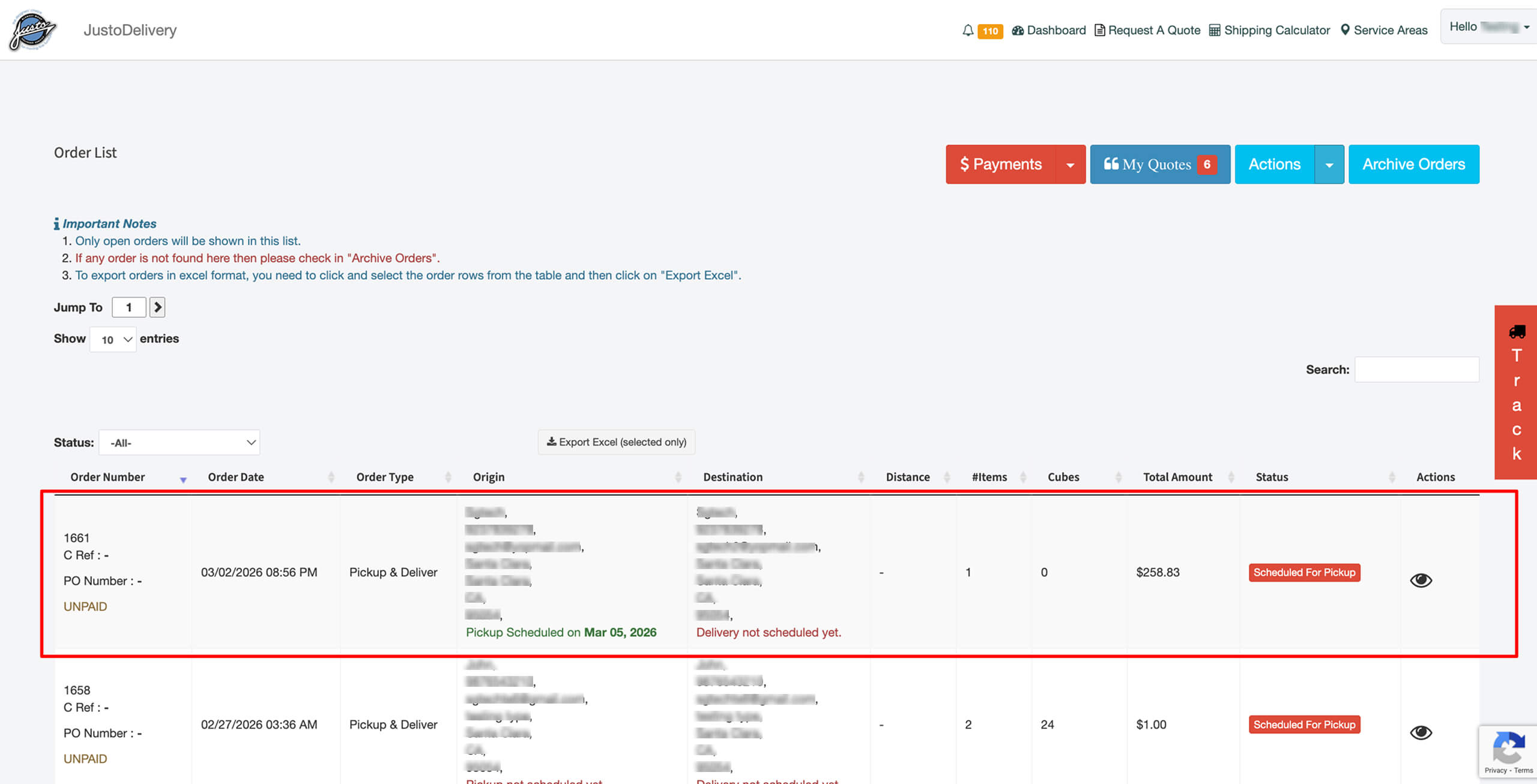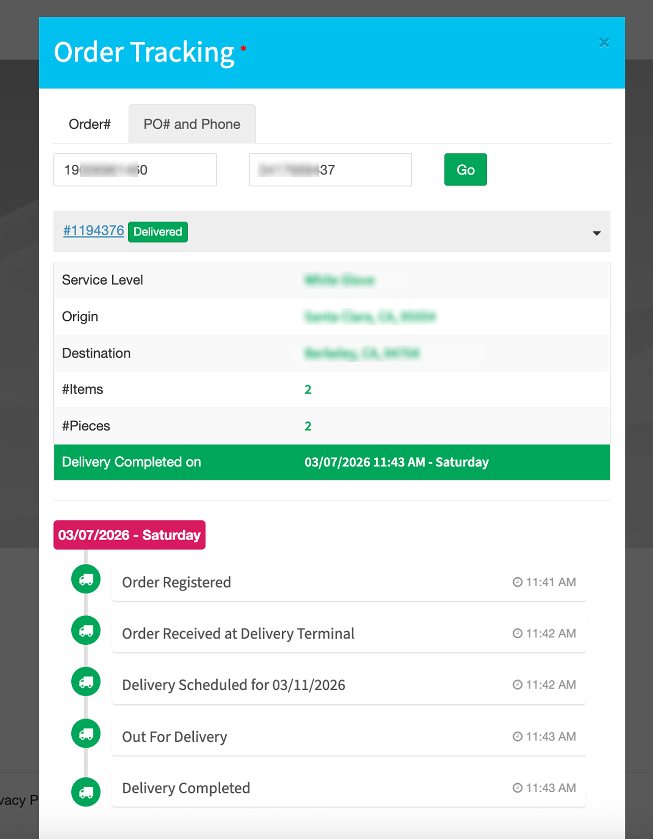 - Order details – such as order type, critical dates, origin and destination addresses.