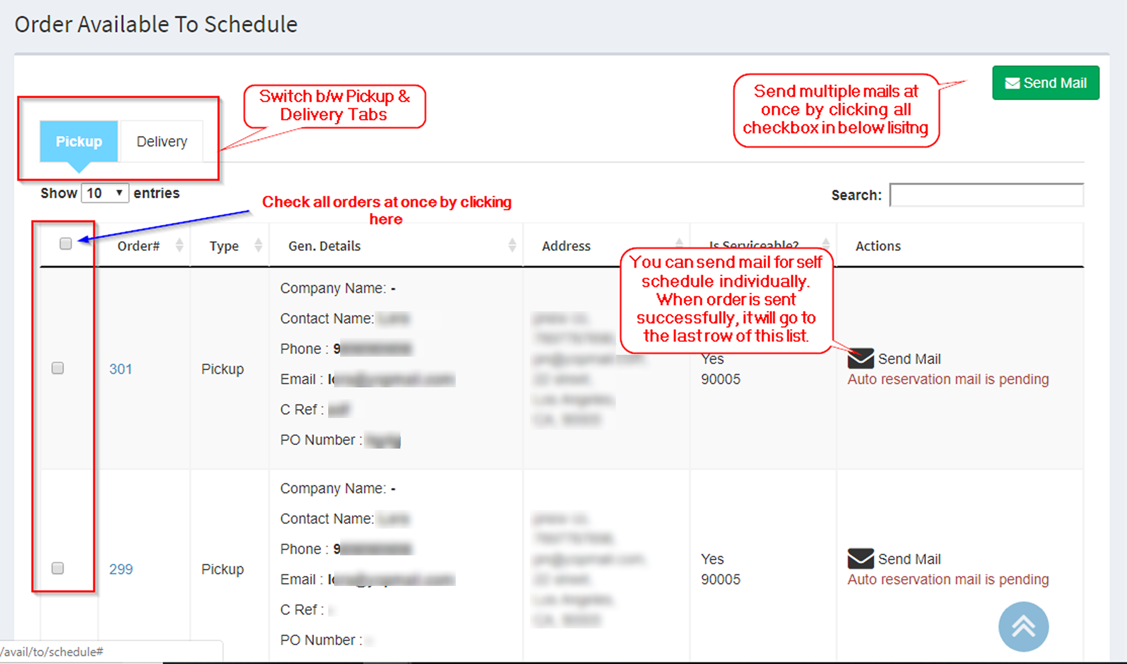 - If you have to send scheduling e-mails for multiple orders at once, then you can select the desired orders and click on the ‘Send Mail‘ button located at top right hand corner of the page.