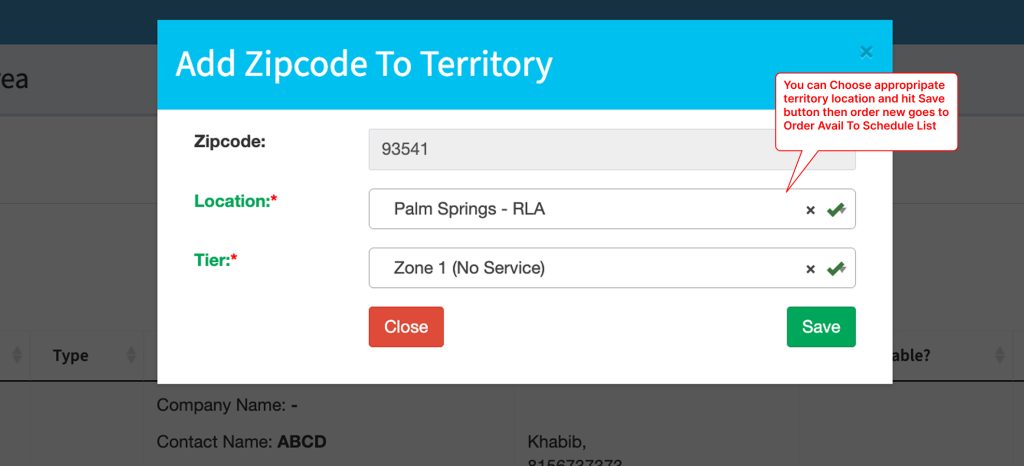 - NOTE: After successfully adding zip code to territory, it will disappear from this list and go to ‘Order avail to schedule’ list.