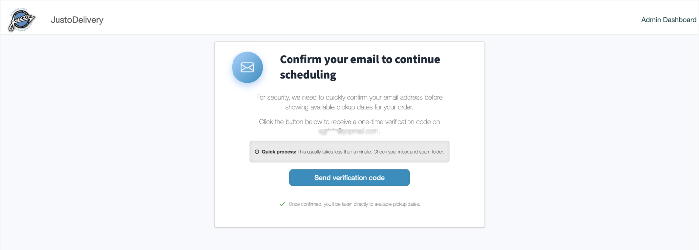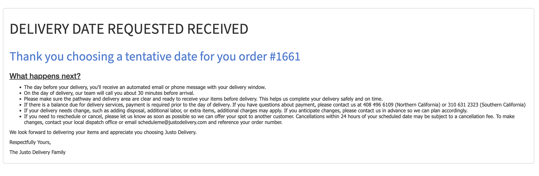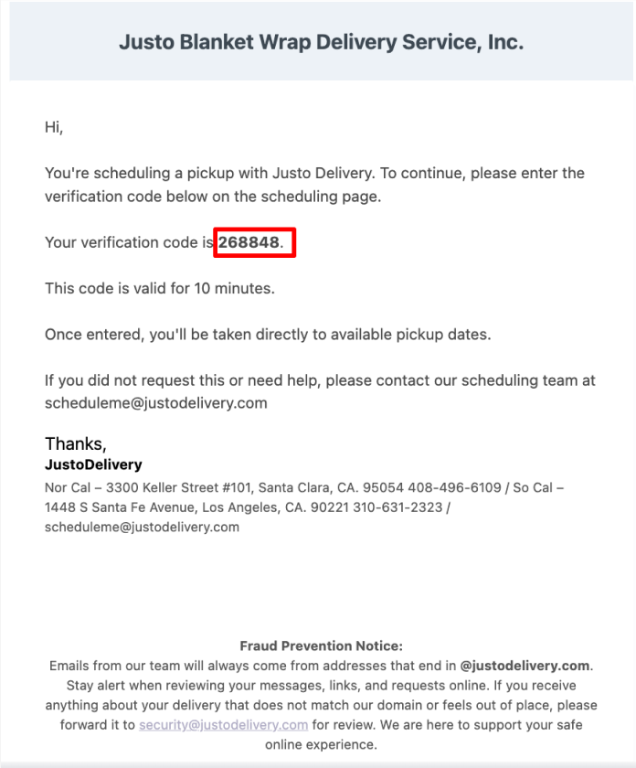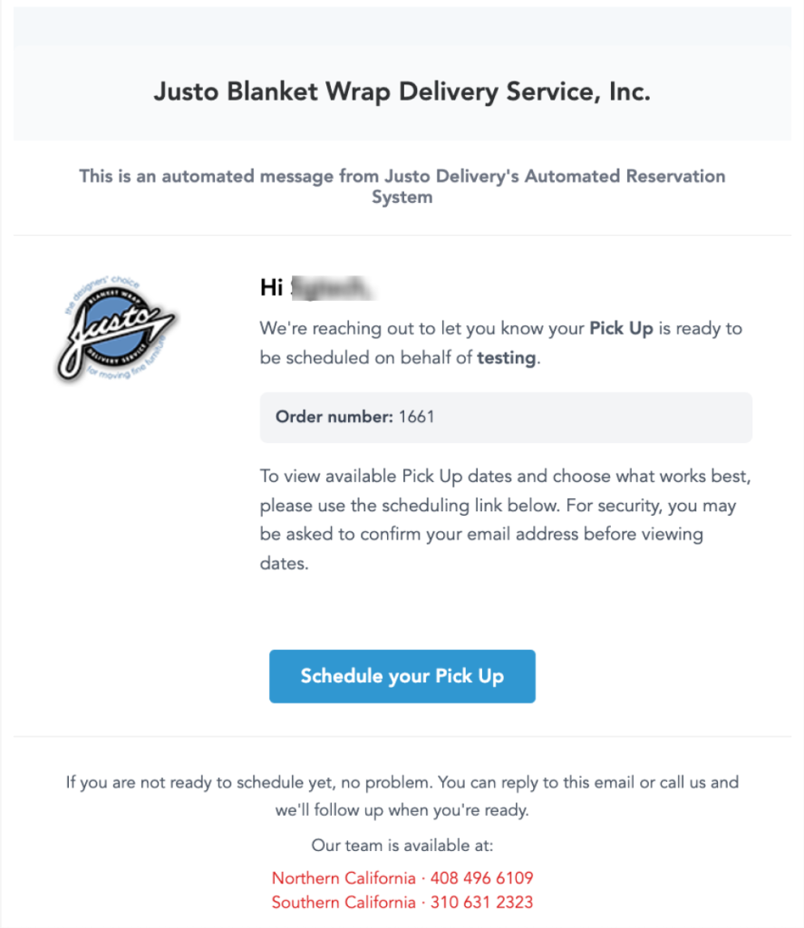 - You will receive an email from Justo Blanket Wrap Delivery Service, Inc. informing you that your pickup is ready to be scheduled.