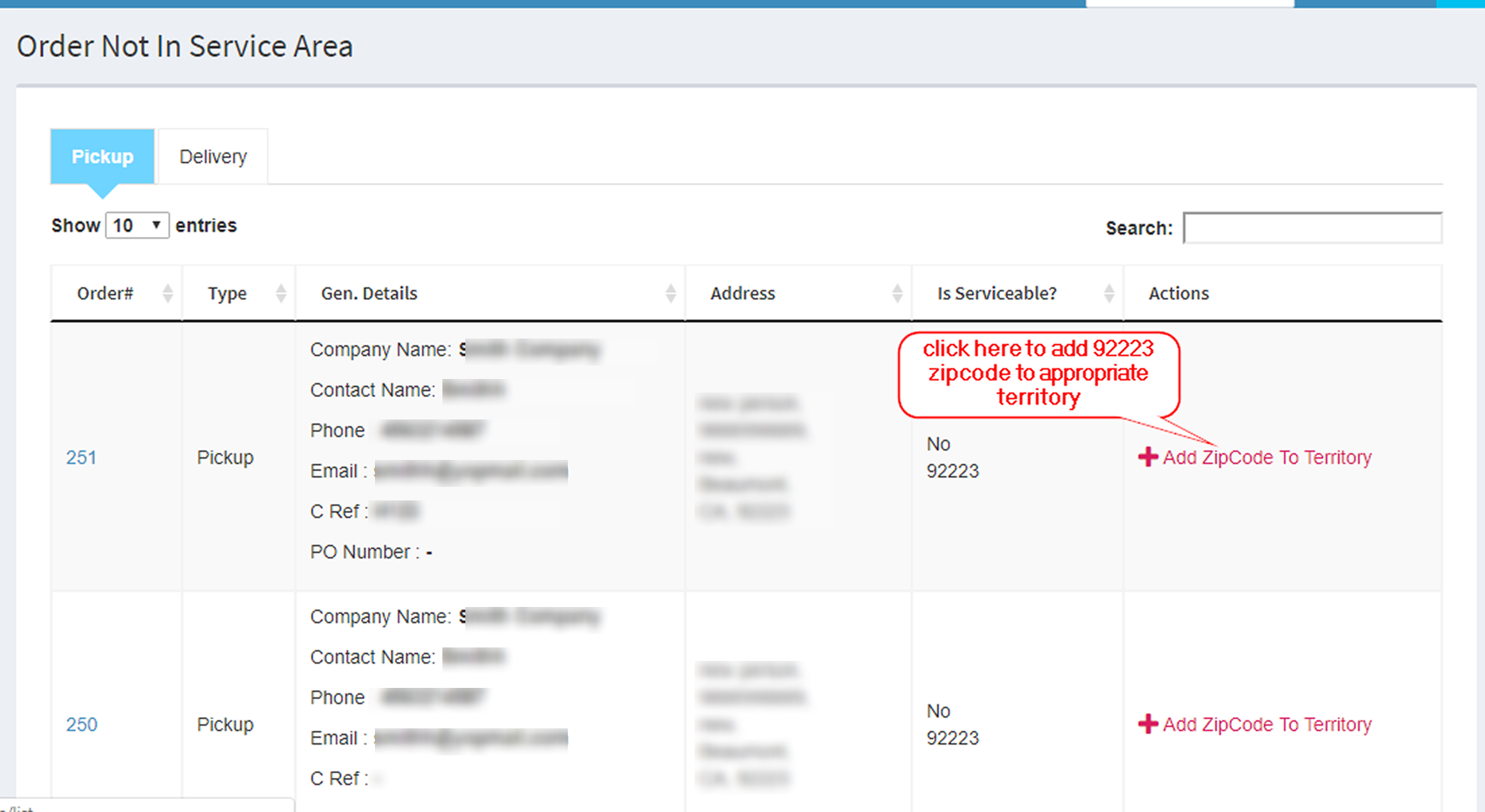 - If the zip code is not present on system, then it will ask to ‘Add zipcode to territory‘ under the ‘Actions‘ column.