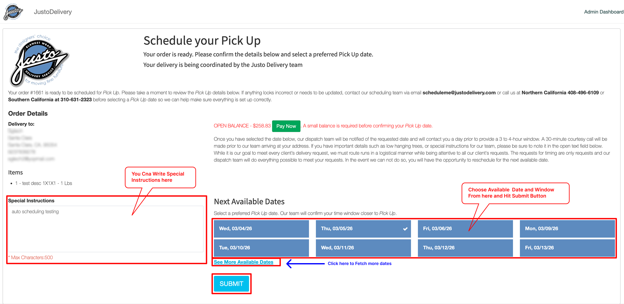 - When clicked on this button, customer will be redirected to our system platform where he/she can choose a desirable date and time window for scheduling and click on submit button. Customer can also add Special Instruction which is an optional field.