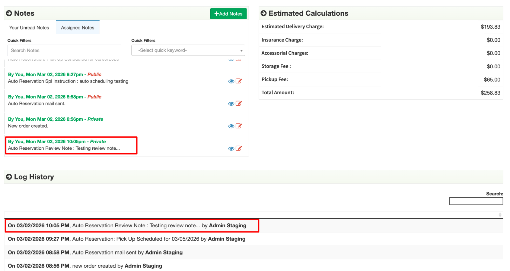 - You can also view other order details such as ‘Special instructions’ added to ‘order notes‘ section. Also all the ‘Auto reservations’ can be checked under order notes.